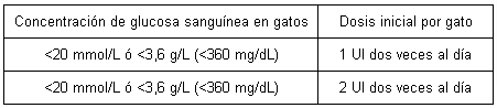 La dosis inicial es de 1 ó 2 UI por inyección, basado en la concentración base de glucosa sanguínea, como se presenta en la siguiente tabla. Los gatos requieren dos administraciones diarias.
